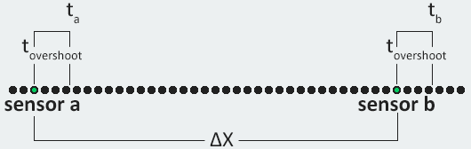 The overshoot problem discussed previously is a non-factor in the steady velocity calculation, since it offsets both the start and end sample times. The timing error from overshoot therefore cancels out.